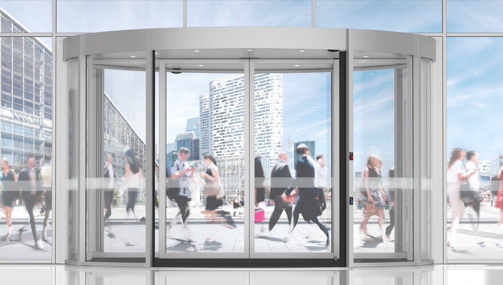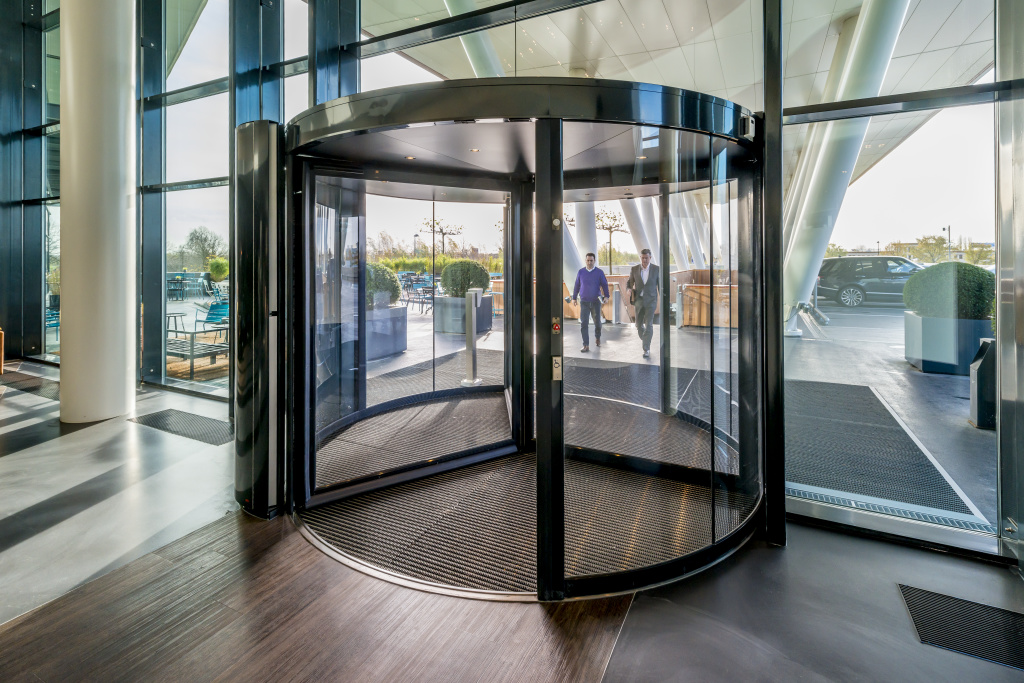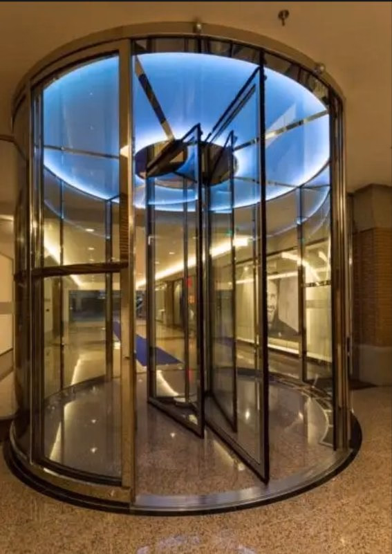 A revolving door with sensor-controlled automatic rotation, providing smooth, hands-free entry while maintaining energy efficiency and controlling indoor climate.