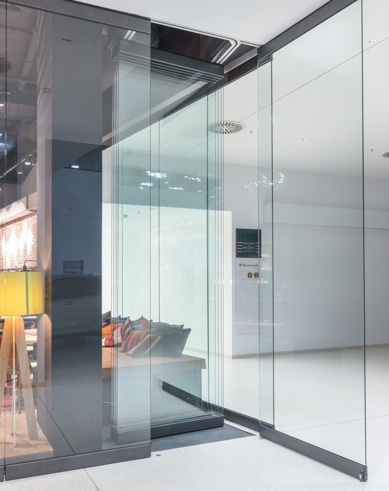 A flexible and stylish glass partition system that slides horizontally to open up spaces or divide rooms, ideal for shopping malls, airports, and offices.