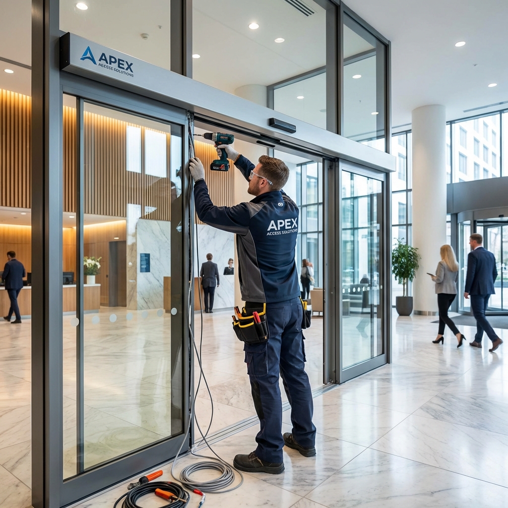 Expert installation of automatic doors by certified technicians ensuring optimal performance and safety compliance.